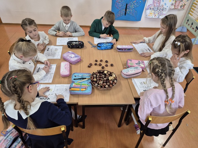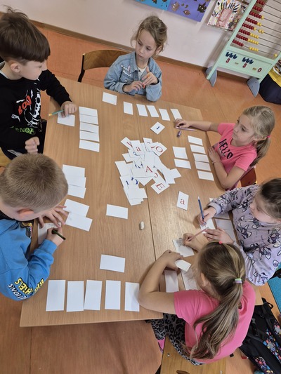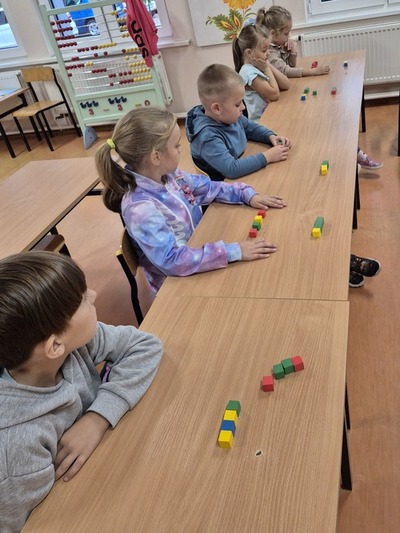 We wrześniu i październiku w zakresie edukacji polonistycznej dzieci ćwiczyły analizę i syntezę głoskową wyrazów, układały wyrazy z poznanych liter, rozpoznawały poznane litery, układały historyjki do zaprezentowanych obrazków. Podczas edukacji matematycznej przeliczały przedmioty w zakresie 6, dodawały i odejmowały liczby w zakresie 6, wykonywały obliczenia pieniężne korzystając z monet 1zł, 2 zł i 5 zł.