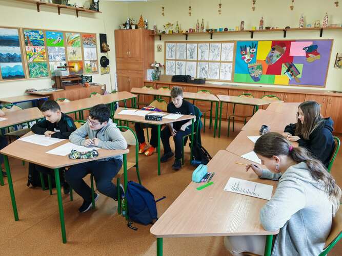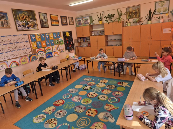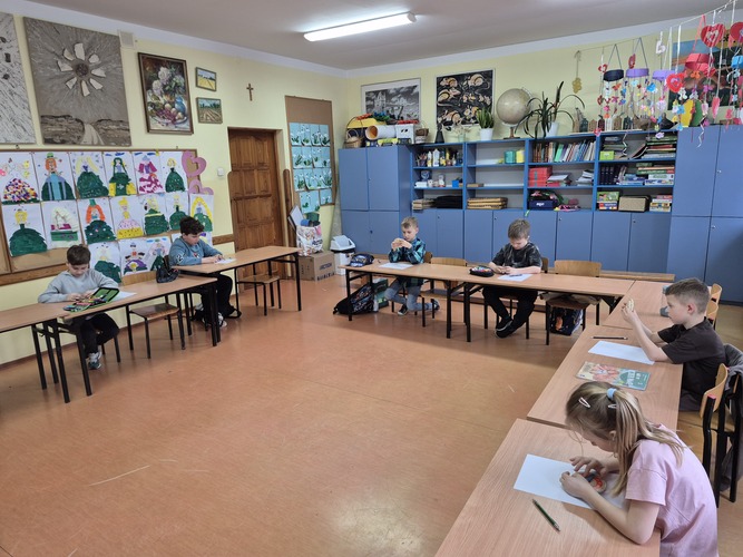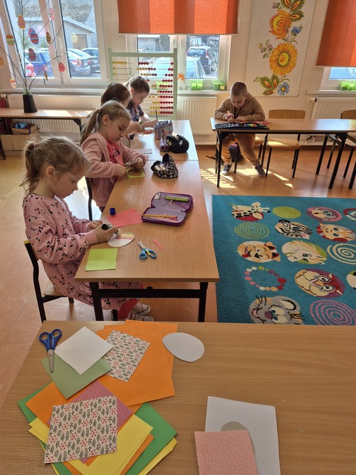 W marcu, podczas zajęć dydaktyczno - wyrównawczych w celu ćwiczenia sprawności ręki, uczniowie wycinali wzory geometryczne i inne elementy do ozdabiania pisanek. Budowali zdania na temat nadchodzących świąt oraz doskonalili technikę głoskowania wyrazów.